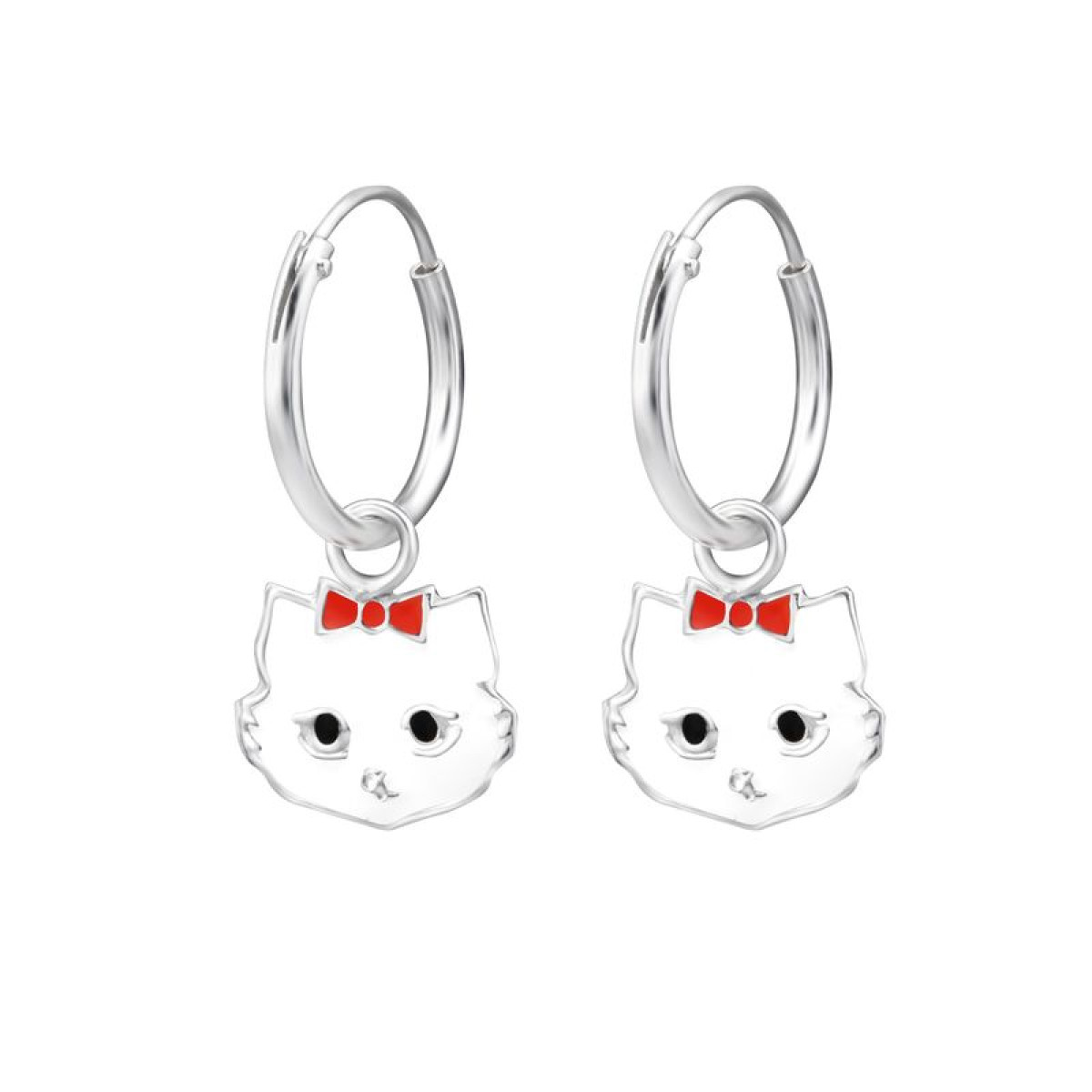 Cicás fehér karika kislány fülbevaló, macskás fülbevaló, gyerek ékszer