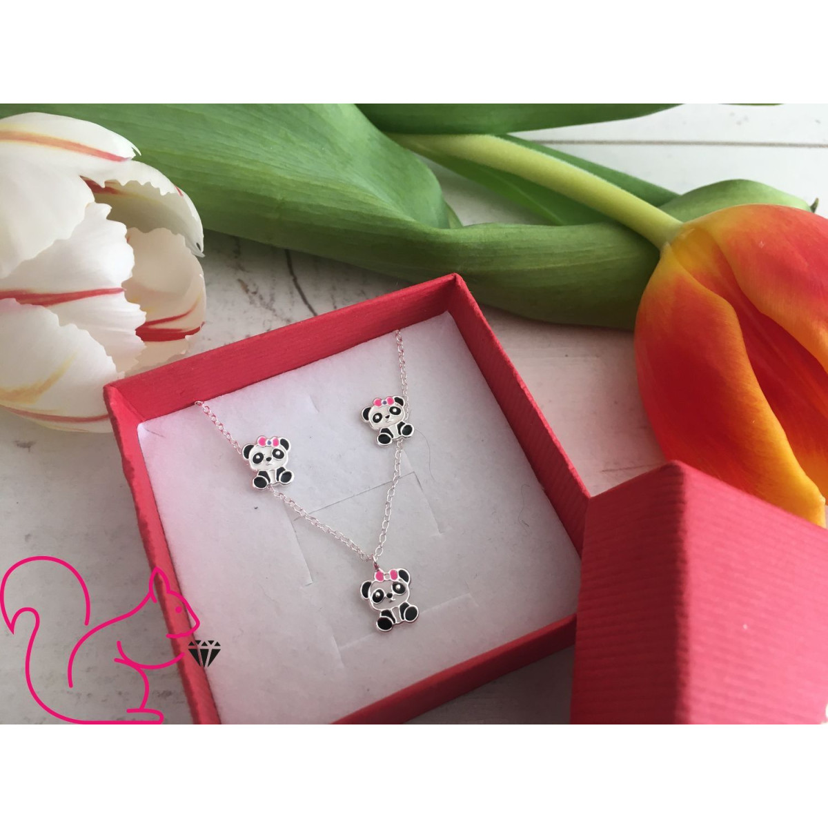 Panda kislány ezüst gyerek ékszer szett, pandamacis nyaklánc és fülbevaló